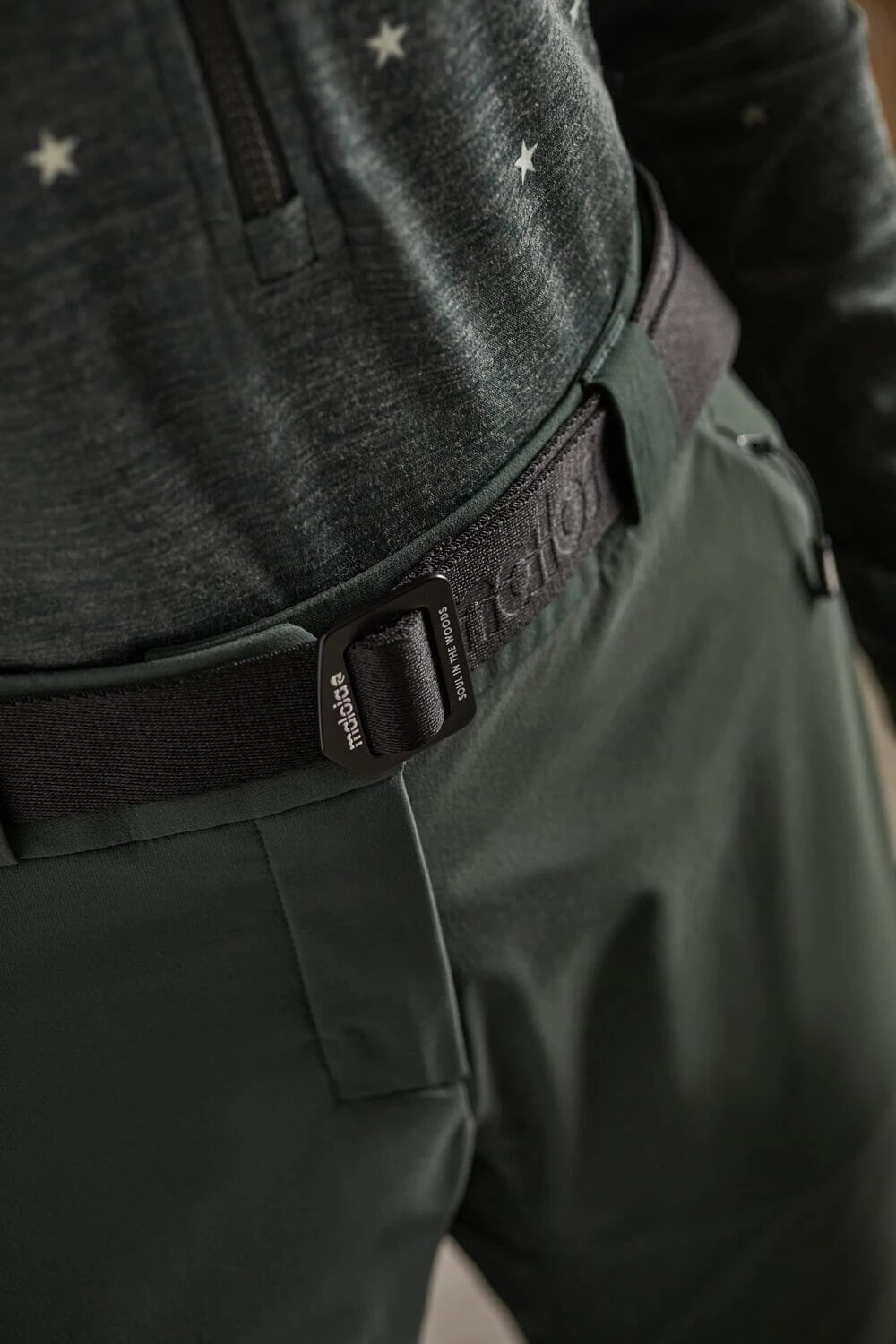 Due to the stretchy material SangayM. offers plenty of freedom of movement during ski touring, the waistband width adjustment, belt loops and zippered leg openings provide good adjustability. Two side zipper pockets and a zipper pocket on the right thigh. Happy Mountain patch on the thigh pocket, Maloja lettering on the back upper left.