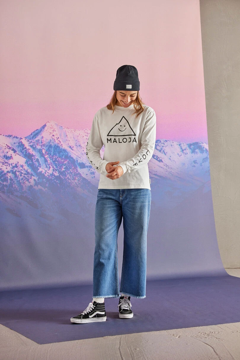 Eco Wash Denim Pants with high waistband and wide culotte leg, two front slash pockets and one coin pocket, two back patch pockets, Maloja patch on back waistband made of recycled leather. Regular fit. Made in Portugal.