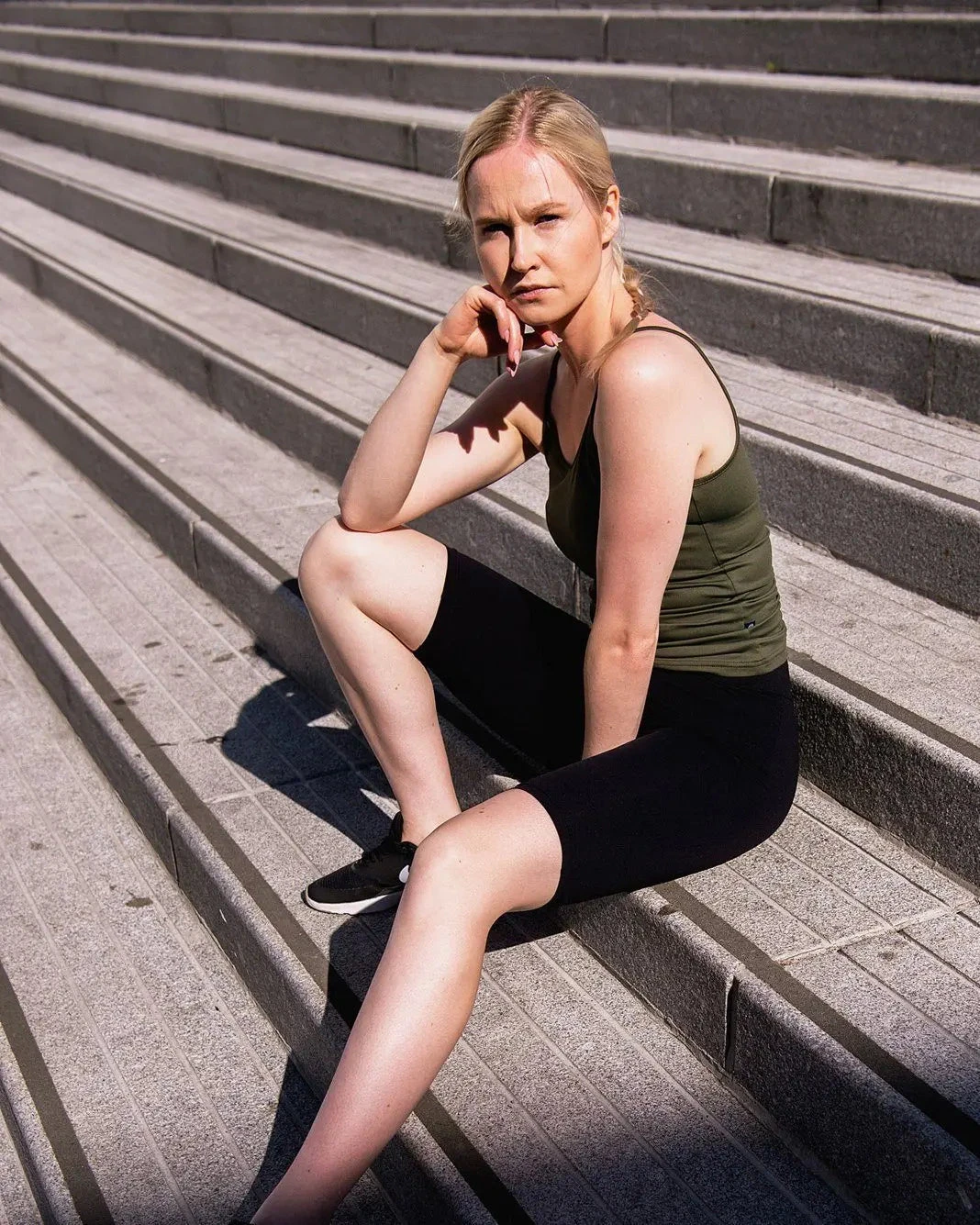Biker shorts length with hi-rise waistband gives additional support for lower back and belly and keeps the pants perfectly in place even in the most intense training. A double seam in legs provides durability and comfort.