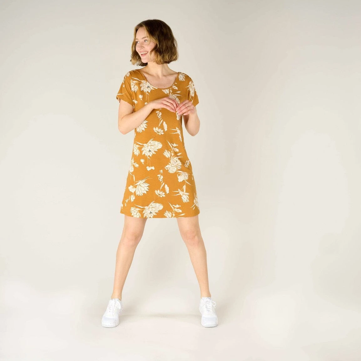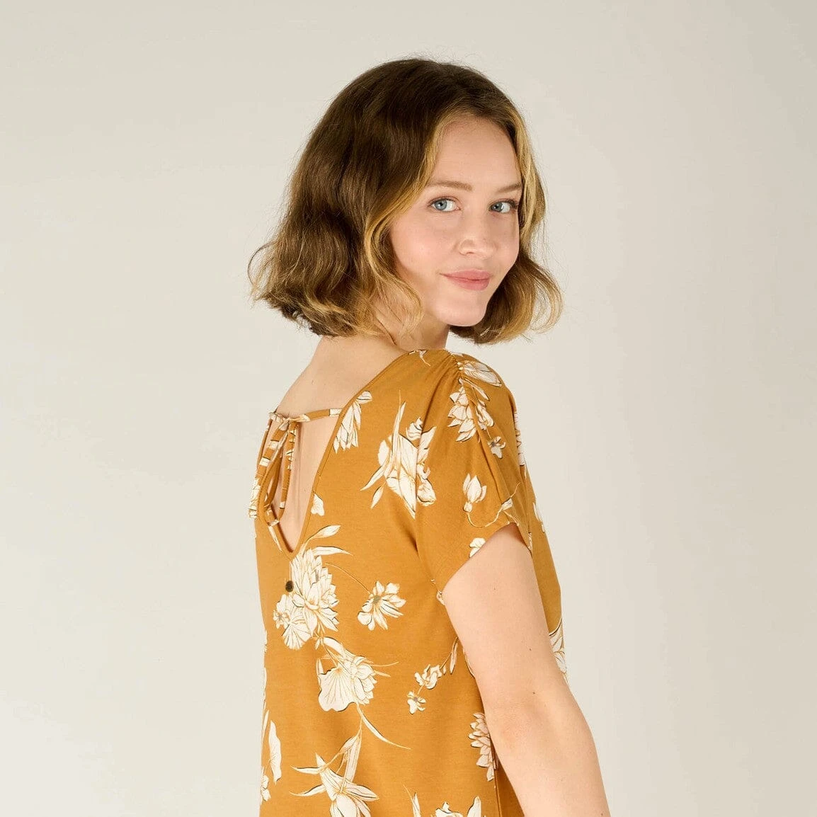 The Padma Tie Back Dress combines all the practicality of a t-shirt dress from the front, with a beautiful V-cut and tie at the nape of the neck. The design of this dress is inspired by the name, meaning ‘lotus’ in Hindi, featuring a gentle cascading lotus flower print, enhancing the flattering drape of the silhouette. The blend of organic cotton, Modal® and spandex gives the fabric a soft, comfortable feel. Subtle, elegant touches such as the small coin, embossed with Sherpa’s endless knot, draws the eye to the feminine features of this dress. Whether exploring the terrain or going out for dinner, the Padma Tie Back Dress is a versatile option, beautiful in its simplicity.