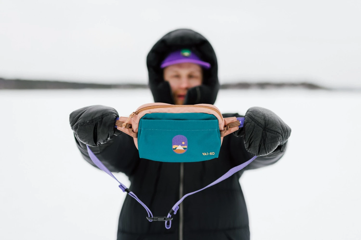 Introducing our Tunturiyö Hip Pack, your perfect companion for daily adventures, designed without compromising style or sustainability. The hip pack is made of recycled PET bottles. The Tunturiyö Hip Pack is full of excellent practical features, such as a roomy main compartment with a zippered inside pocket, ideal for securely stowing your valuables. The front pocket, featuring a strong magnetic closure, offers quick and effortless access, making it a convenient choice for stashing your daily essentials. The back side includes a softly padded pocket, designed to keep your phone safe and close at hand.