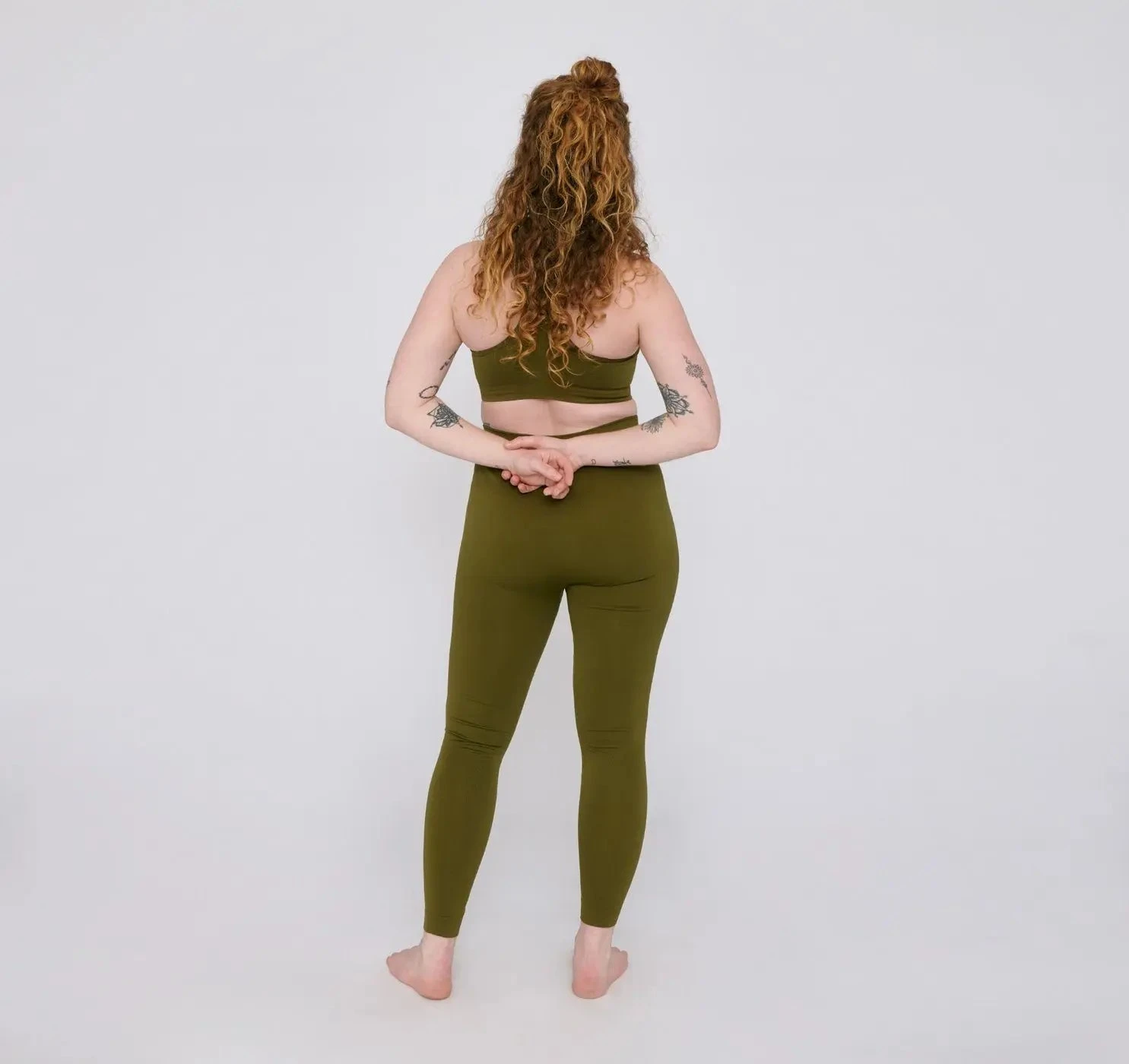 Sweat-wicking, breathable, full length leggings made with recycled materials.