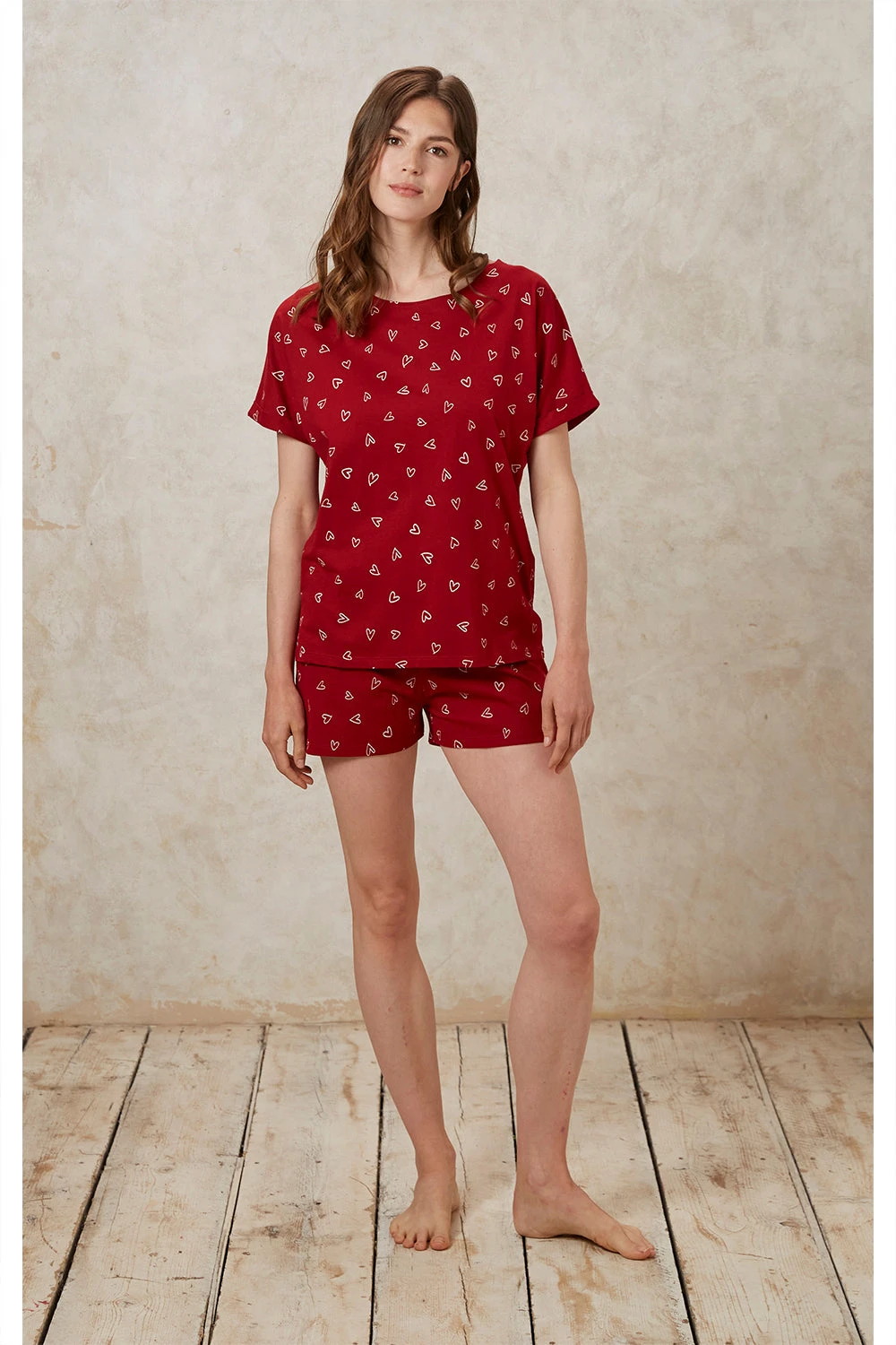 Lightweight, organic and breathable Hearts print pyjama tee. This comfortable pyjama collection features a sweet heart motif on a deep red base, and is perfect for lounging or sleeping.
